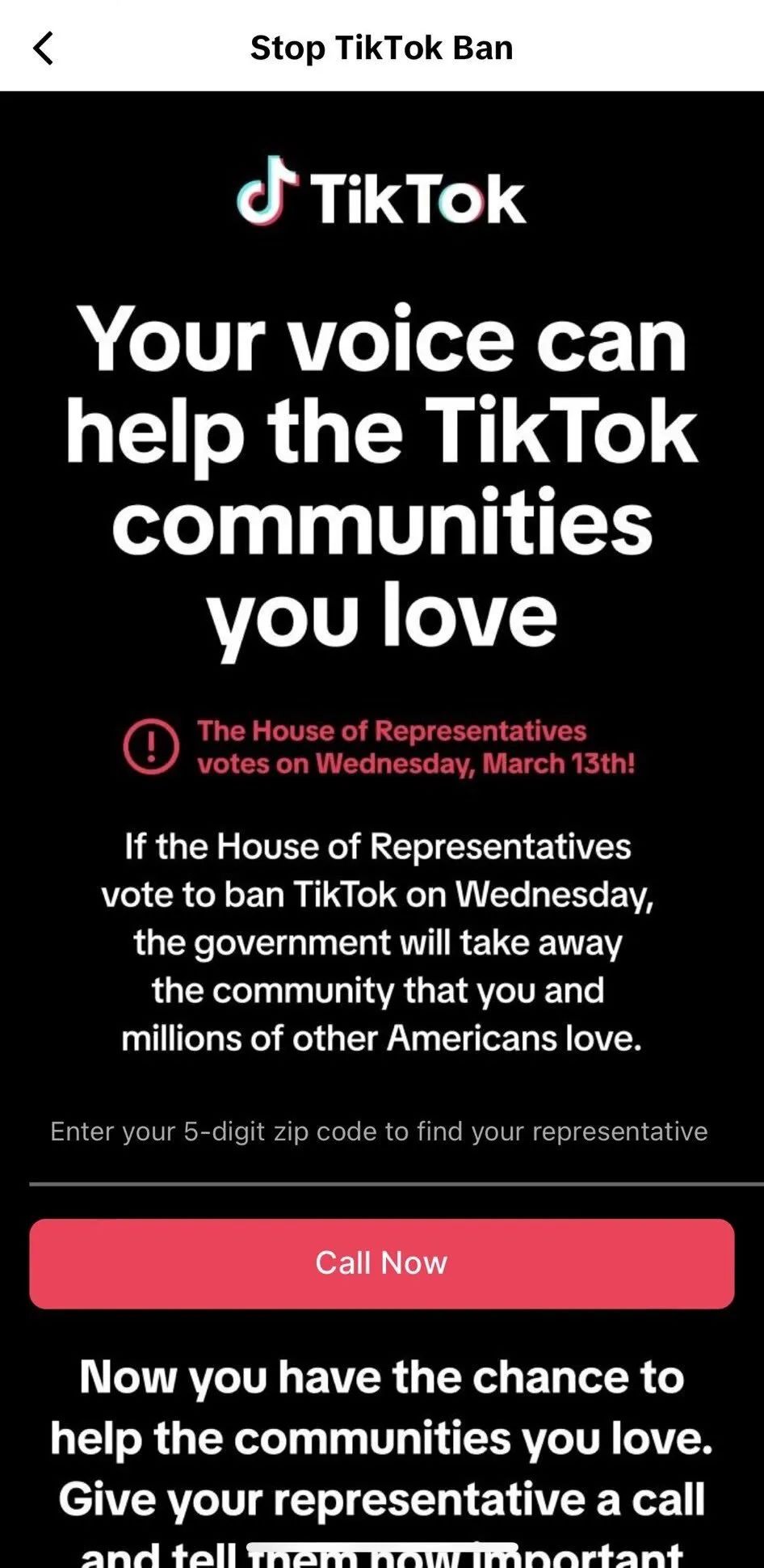 3月7日,面对被封杀与被迫卖身二选一的两难困境,TikTok绝地反击,选取了较为激进的应对措施,给其1.7亿的美国用户发送了弹窗提示。TikTok在弹窗提示里建议用户给美国议员打电话、投反对票,要求国会撤销相关立法提案," 让国会知道 TikTok 对你意味着什么,告诉他们投反对票 "。