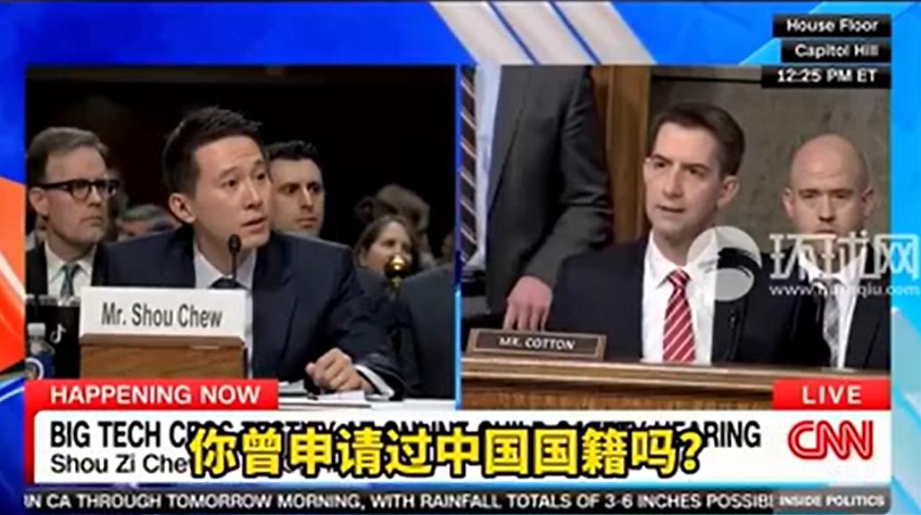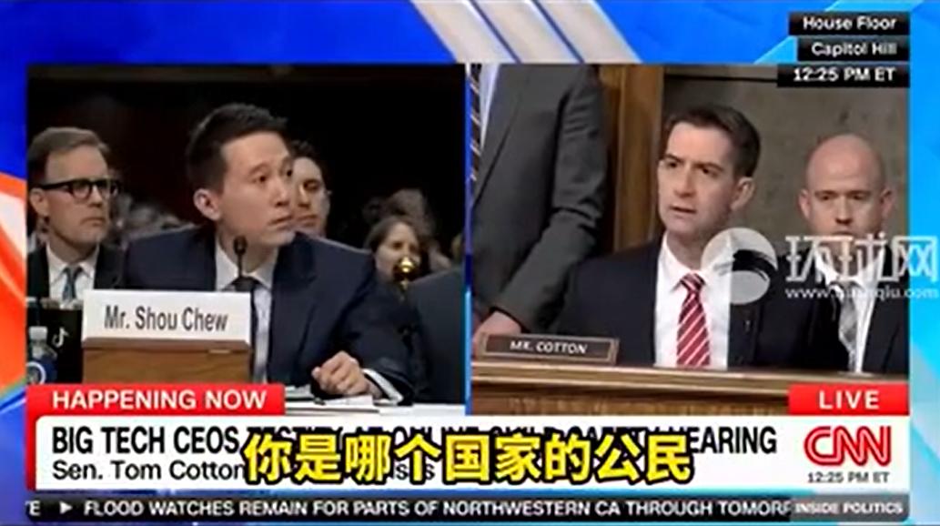共和党籍参议员汤姆·科顿(Tom Cotton)尤其咄咄逼人,他向TikTok CEO周受资一连抛出8个尖锐问题,反复询问TikTok CEO周受资护照所在地、国籍。其中还包括,TikTok是否与中国政府分享了美国用户数据等。