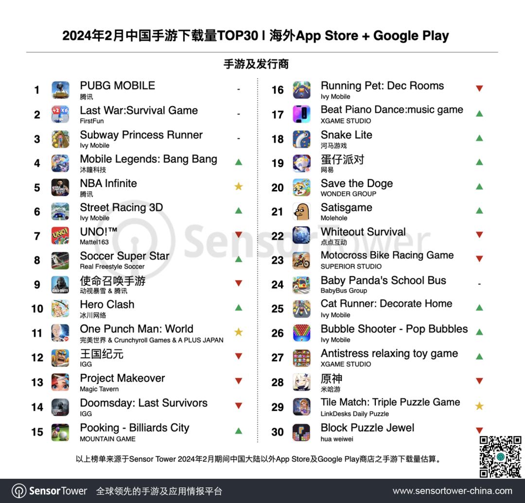 Sensor Tower同时发布了2024年2月中国手游下载榜TOP30,2月份的下载冠军依旧由腾讯《PUBG Mobile》蝉联。