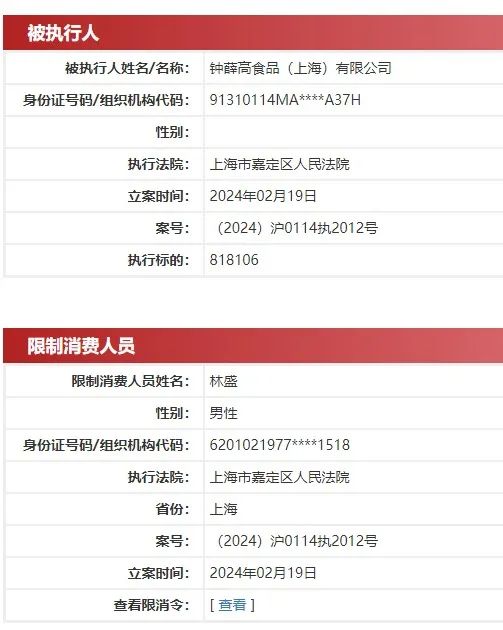 据中国执行信息公开网,3月11日,上海市嘉定区人民法院发布一则限制消费令,因“未按执行通知书指定的期间履行生效法律文书确定的给付义务”,钟薛高食品(上海)有限公司(以下简称钟薛高)及其法定代表人林盛被限制高消费。