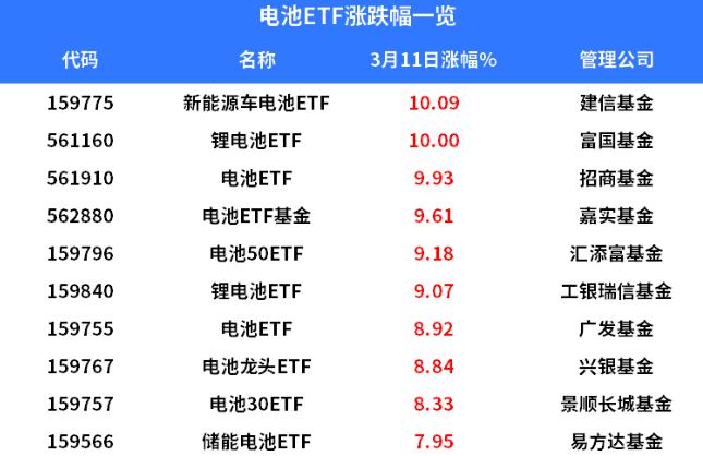 一个板块出现几家头部公司涨停很常见,但几乎整个板块都实现涨停的情况却极为罕见。这种罕见情况就发生在前几天的锂电板块。3月11日,新能源车电池ETF、锂电池ETF单日涨幅都在10%以上,市面上最主要的10支电池ETF单日涨幅都在7.9%以上。