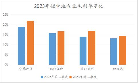 但从实际情况看,锂电保住了盈利能力。2023年前三季度,宁德时代毛利率同比增加了3个百分点,亿纬锂能同比增加了0.9个百分点,国轩高科毛利率同比增加了2.8个百分点。