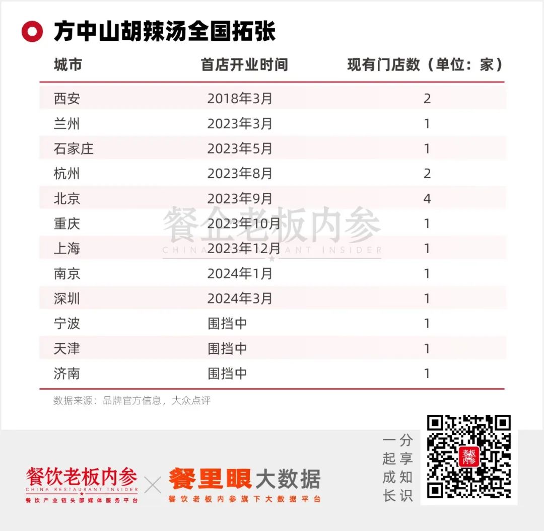2023年开始,方中山胡辣汤在门店拓张方面,“走出河南、全国拓张”的趋势更加明显。品牌新增门店中,不少是河南省外、位于一线新一线城市的城市首店。