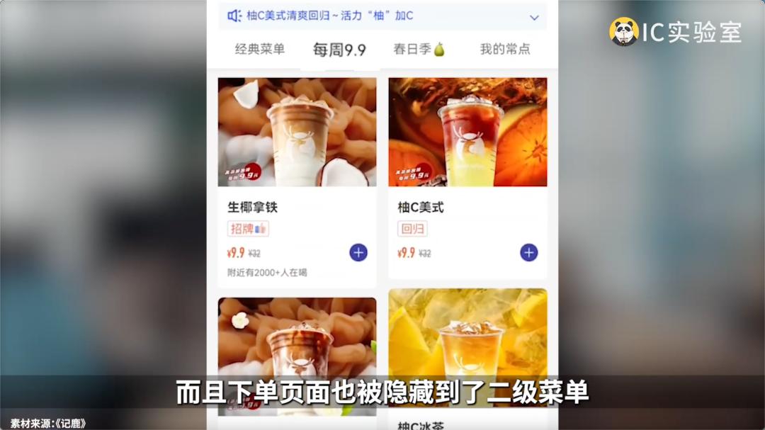 以前绝大部分饮料都可以用九块九,现在只剩下了10款。而且下单页面也被隐藏到了二级菜单。态度很明显,这个九块九的羊毛,不想让咱们薅了。