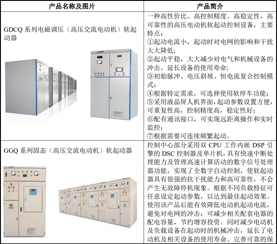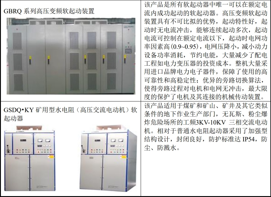公司主要产品包括软起动(含补偿)设备、高低压变频调速设备、高低压成套设备、负载测试设备等系列产品。