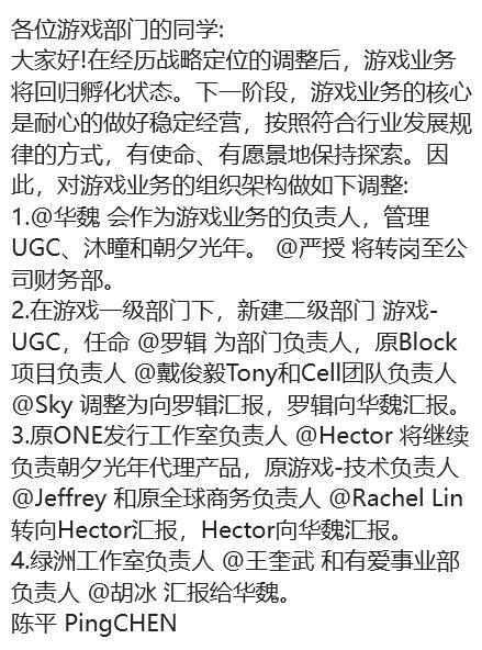 在游戏一级部门下,新建二级部门「游戏-UGC」,由原江南工作室GM罗辑(胡天磊,人称鸟叔)为部门负责人,原UGC项目「Block」负责人戴俊毅Tony,以及引擎团队Cell负责人Sky调整为向罗辑汇报,罗辑向华魏汇报。