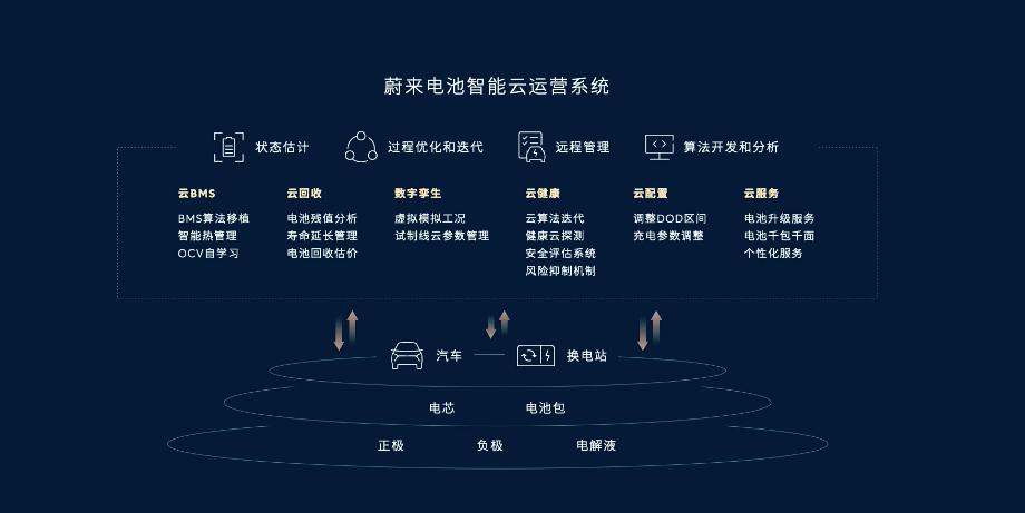 除了在电池本身的物理和化学层面上做出改善,在解决电池寿命问题的运营方面,蔚来建设了电池智能云运营系统,包括云 BMS、云回收、数字孪生、云健康、云配置、云服务六大板块。