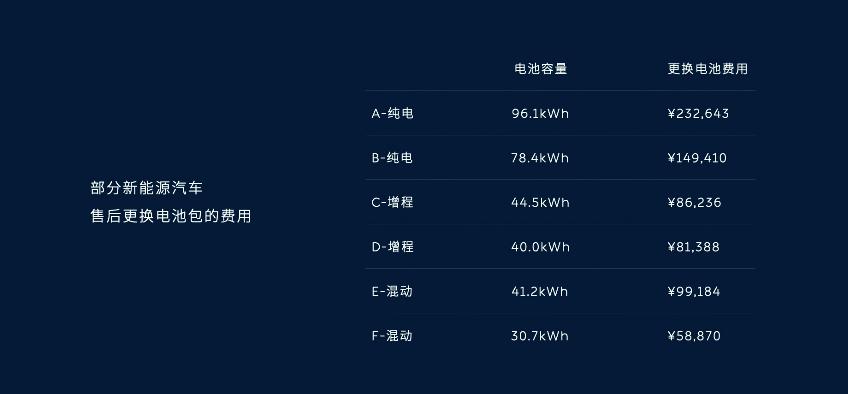 同时李斌还给出了部分新能源车售后更换动力电池包的费用,最高的已经超过23万元,就算是最便宜的,电池容量为30.7kWh的混动车型,也要将近6万块。这意味着,在电池质保到期后,更换电池将会是一笔不小的开支。