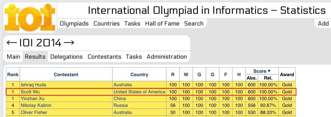 Scott Wu曾在2014年举办的IOI(国际奥林匹克信息学竞赛)上以满分的成绩获得第一名。