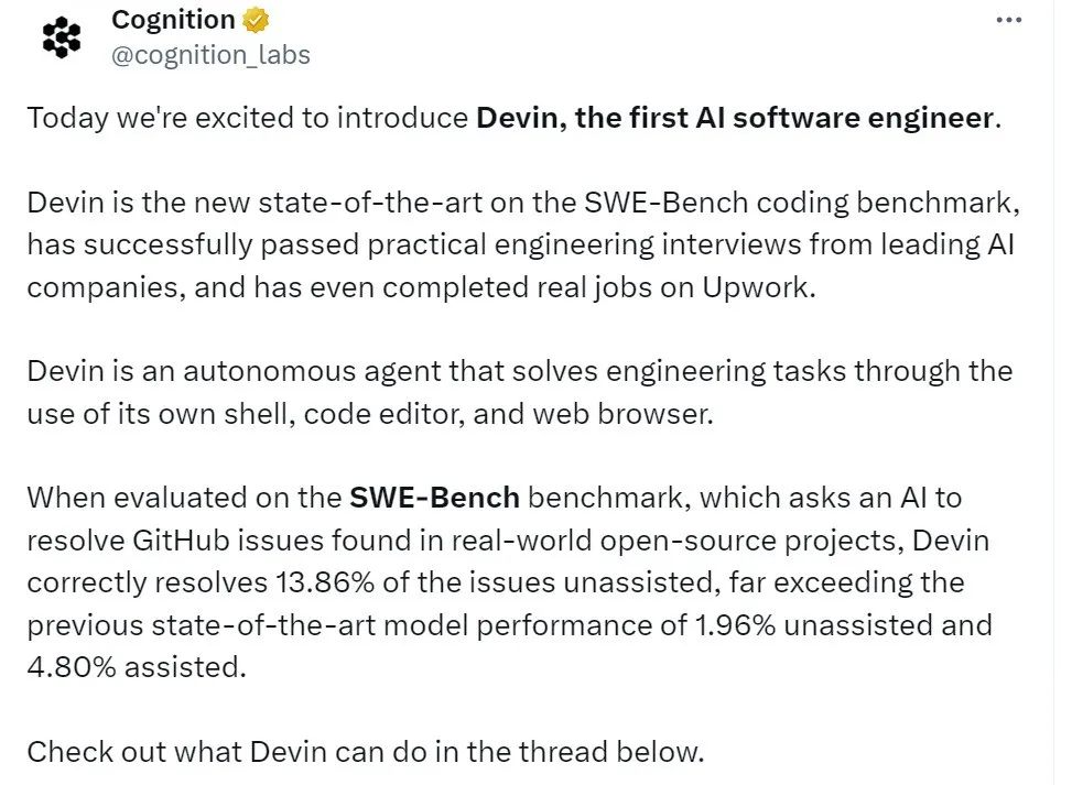 3月13日,Cognition AI在 X 上推出了全球首个AI软件工程师Devin。