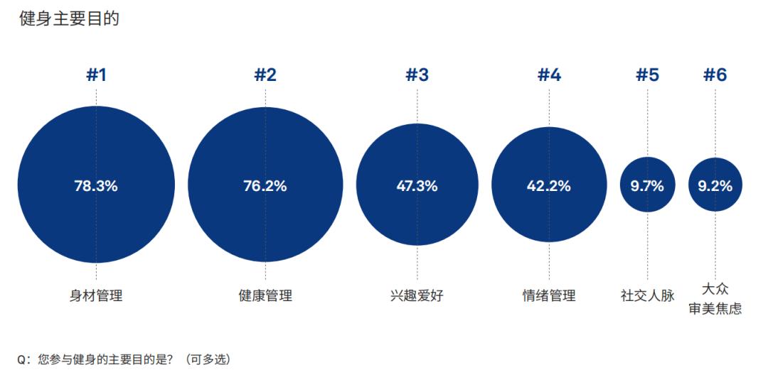 另外,在精练GymSquare发布的《2023中国健身和健康生活方式行业报告》中,有一组数据能反应线下健身消费者的健身目的。其中,选择身材管理的占78.3%,而出于健康管理来到健身房的人数占比,从两年前的64.1%增加到了当下的76.2%。可见消费者对于健身的需求确实在慢慢发生变化。