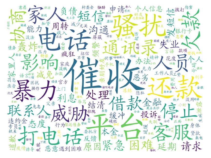 通过数据不难看出,消费者对互联网金融平台反应强烈,“催收、还款、暴力、通讯录、威胁”都是被高度关注的点。