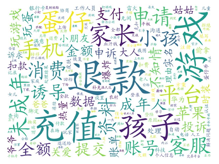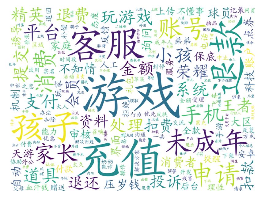 数据显示,被消费者投诉较多的游戏是网易的蛋仔派对和腾讯的王者荣耀。关键词为孩子、未成年、小孩,不难看出投诉的主要问题是未成年人游戏消费问题。