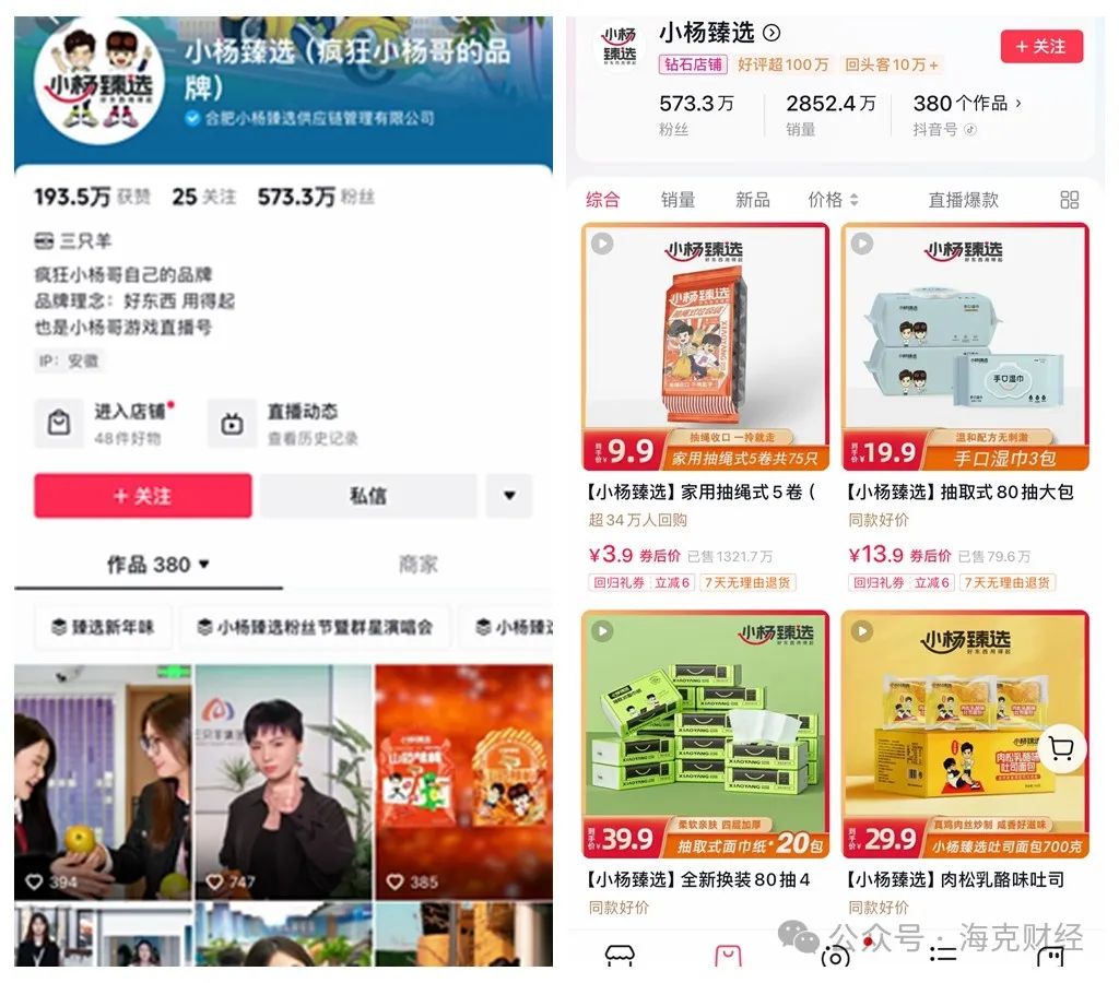 除了在各个垂类直播间和徒弟直播间频繁露脸带流量,小杨哥还将自身流量着重分配到了自家品牌“小杨臻选”上——从品牌名也一望可知。