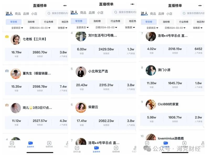 粉丝超过600万的七老板因为固定在美妆领域带货,目前是小杨哥徒弟中带货能力最强的。据第三方平台三眼查数据,在抖音直播2024年3月3日带货日榜上,七老板以2680.7万销售额排榜首。