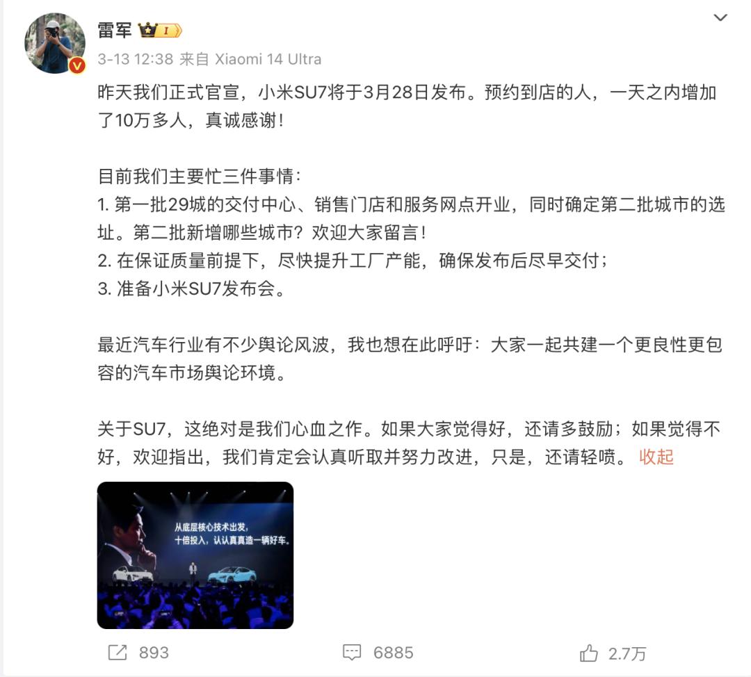 值得注意的是,雷军提到在开放预约到店品鉴后,一天之内(到店预约)增加了10万多人,这相当于就有了10万个销售线索,可见小米SU7的热度。