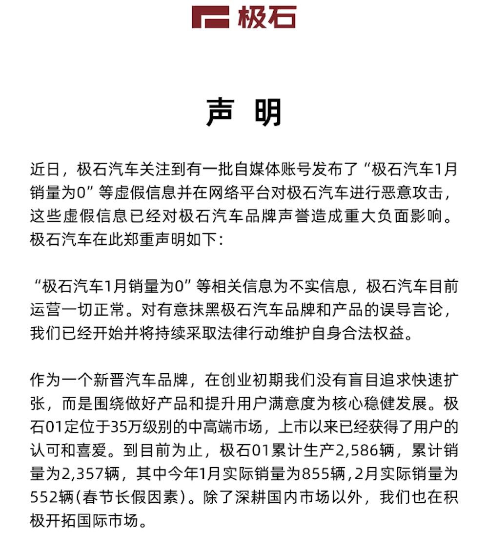 对此,在3月11日晚,极石汽车通过官方微博发布声明,回应了近期某些自媒体账号散布的关于“极石汽车1月销量为0”的不实消息,并指出这些账号在网络上对极石汽车进行了恶意中伤。