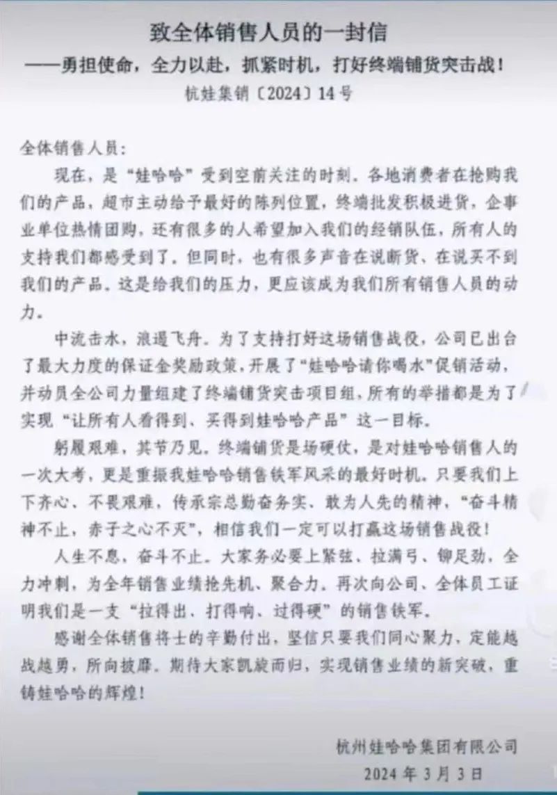 信中提到:现在是娃哈哈受到空前关注的时刻;要打好终端铺货突击战,目标是“让所有人看得到、买得到娃哈哈产品”。