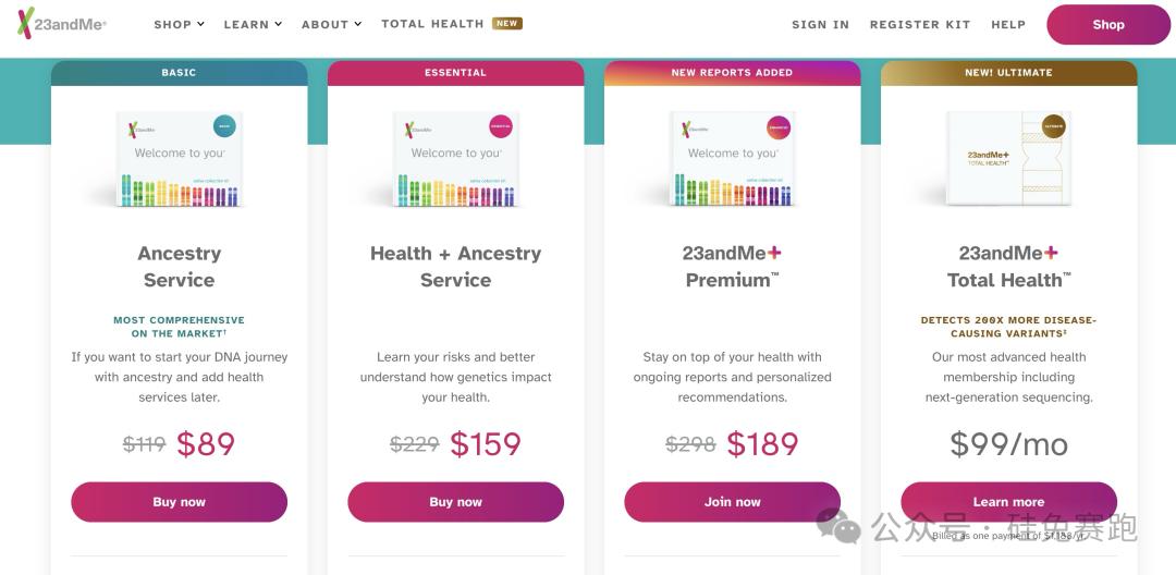 23andMe也在努力通过增加多元化服务创造收入,从仅提供信息的科技公司变为既能提供信息又能提供治疗的医疗公司。比如,推出年度付费产品Total Health,提供半年一次的血液测试、外显子测序和基于遗传学的临床护理。