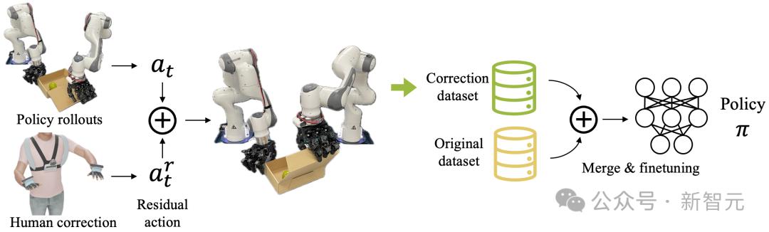 最后,这些纠正动作会被记录并保存在一个新的数据集中,并与原始训练数据一起进行均匀采样,从而更好地调整机器人的行为策略。