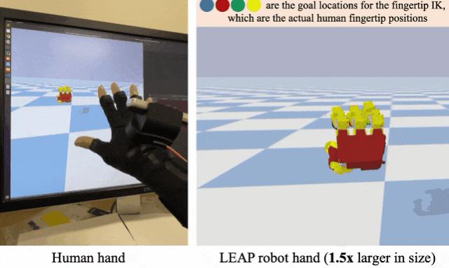 LEAP手比人手大了约50%,这种尺寸差异使得很难将手指运动直接转移到机器人硬件上。