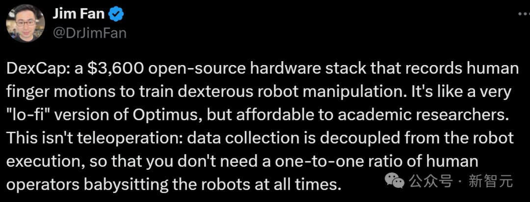 Jim Fan认为DexCap是「低配版的Optimus」,关键只要3600美元,一般人也能买得起。