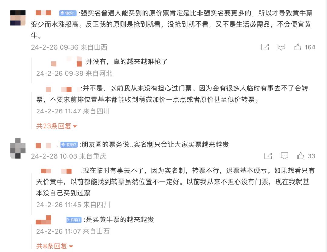 而且在高门槛下,如今的黄牛溢价也越来越离谱。这也引发“强实名制意义何在?”的争议,一方面有消费者认为“强实名导致了买票越来越贵”,另一方面也有消费者表示“强实名普通人能买到的原价票肯定是比非强实名要更多的,所以才导致黄牛票变少而水涨船高。”