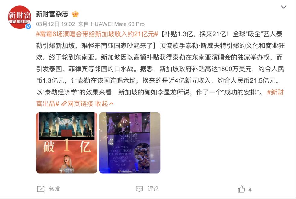 媒体爆料,新加坡政府为每场Taylor Swift演唱会提供高达300万美元的补贴,并开出条件要求新加坡成为Taylor Swift全球巡演的唯一东南亚站,该消息还引发了泰菲等国家的不满。
