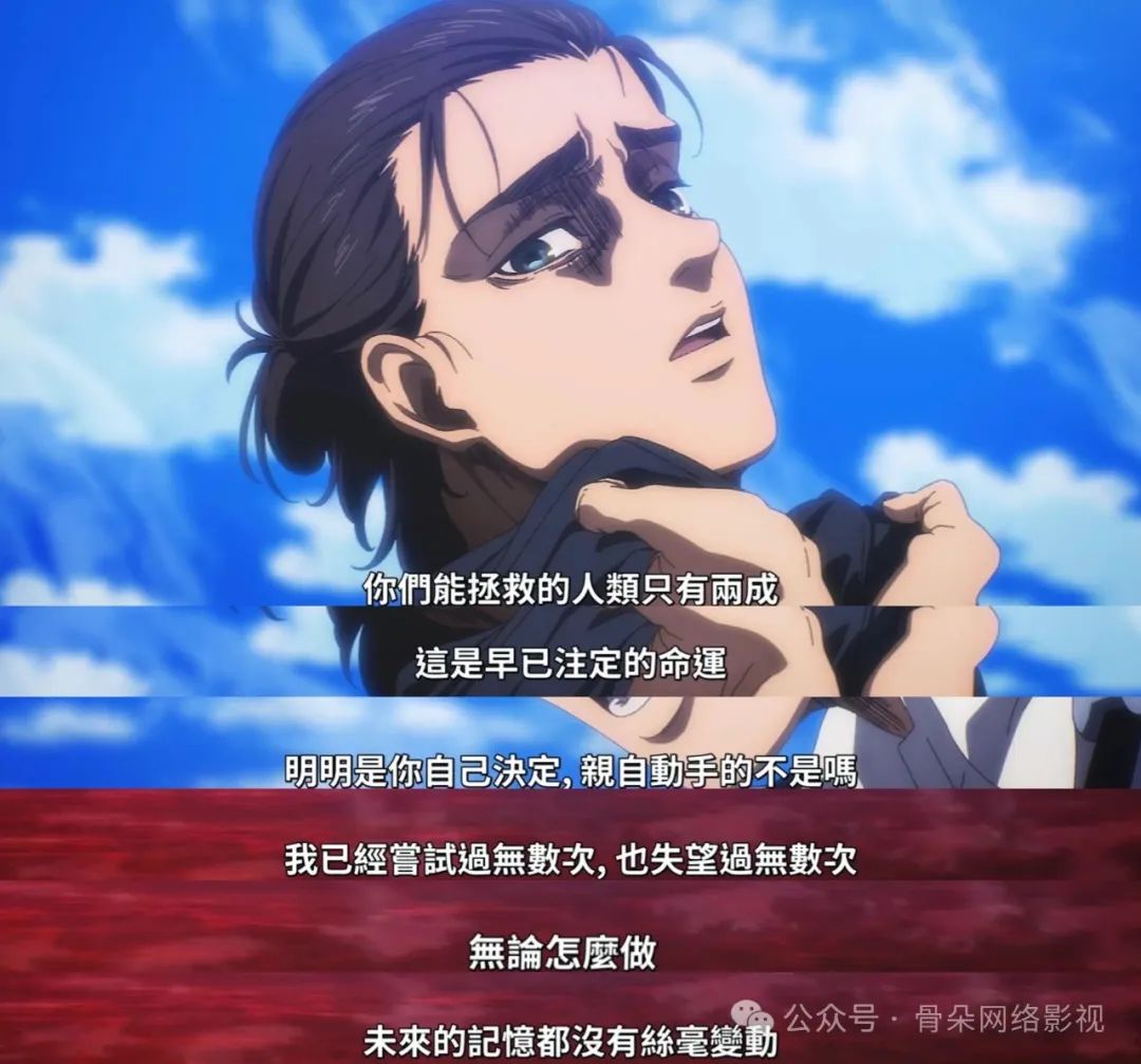除了好莱坞的宏篇巨作,日本的《进击的巨人》作为近十年来最受关注的动漫作品,其中也拥有着救世主叙事。艾伦是帕拉迪岛上的救世主,为了拯救自己的民族,他选择发动地鸣,召唤出大量巨人,屠杀墙外百分之八十的人类。对于帕拉迪岛民来说,艾伦是救世主,但对于岛外的其他民族来说,他就是恶魔。如果“救世主”没有对苍生的悲悯之心,只有对目标的执着欲望,那他就是一个掌握巨大权力的笨蛋,他会把人们导向死亡和仇恨,而不是爱与和平。