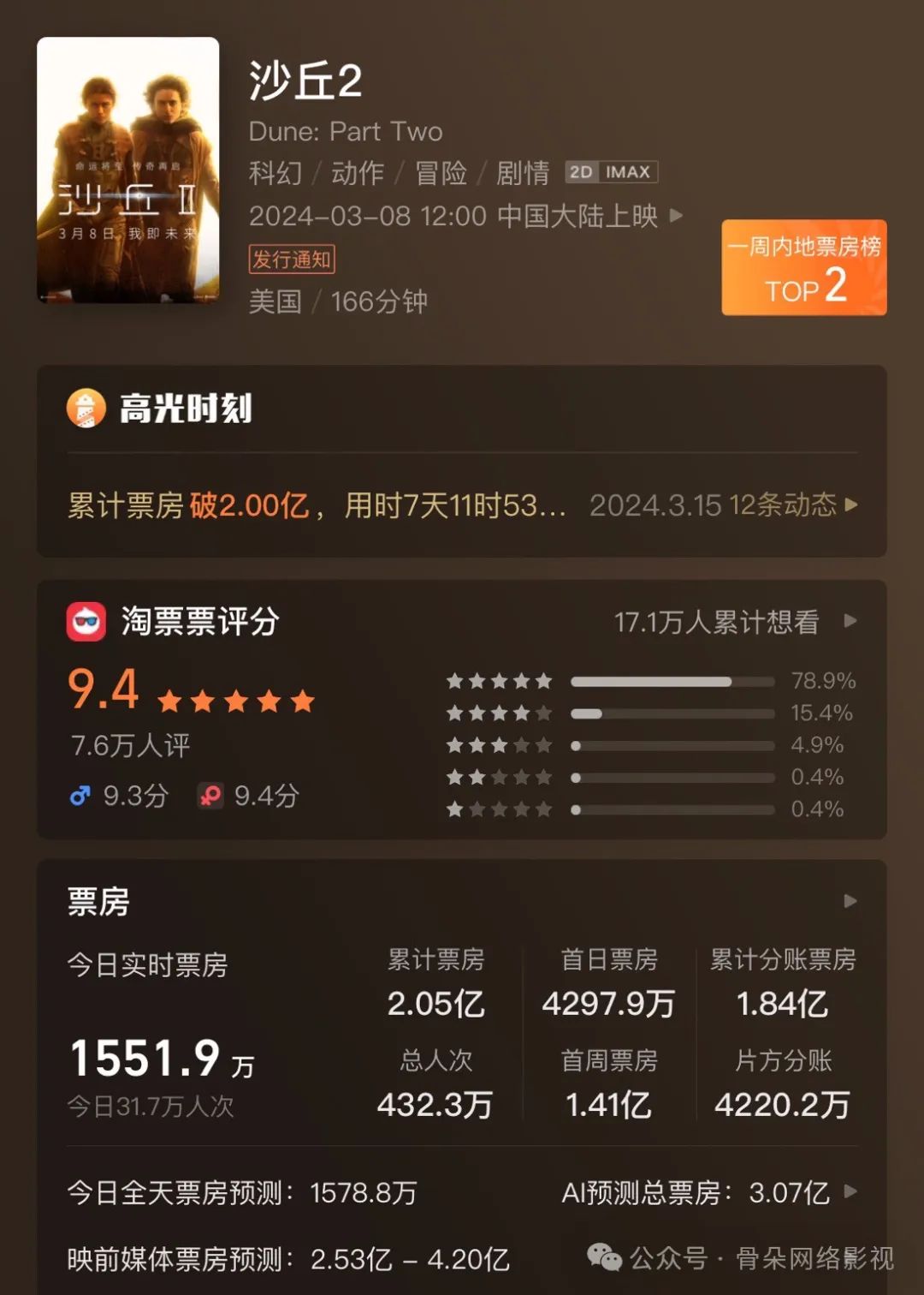 不过,《沙丘2》表达的宏大世界观和深刻的含义,并没有完全转化成票房。