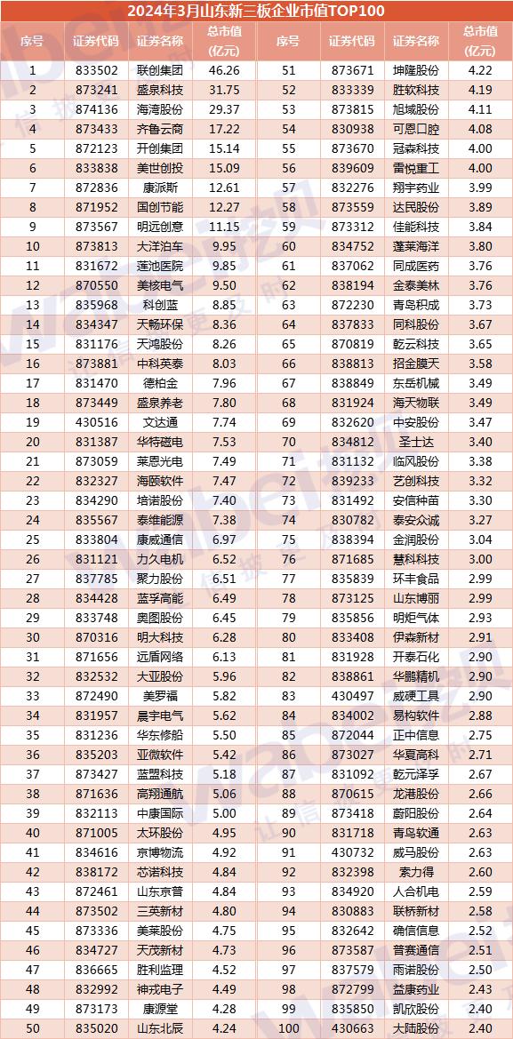 附-2024年3月山东新三板企业市值TOP100(数据截至3月14日收盘)