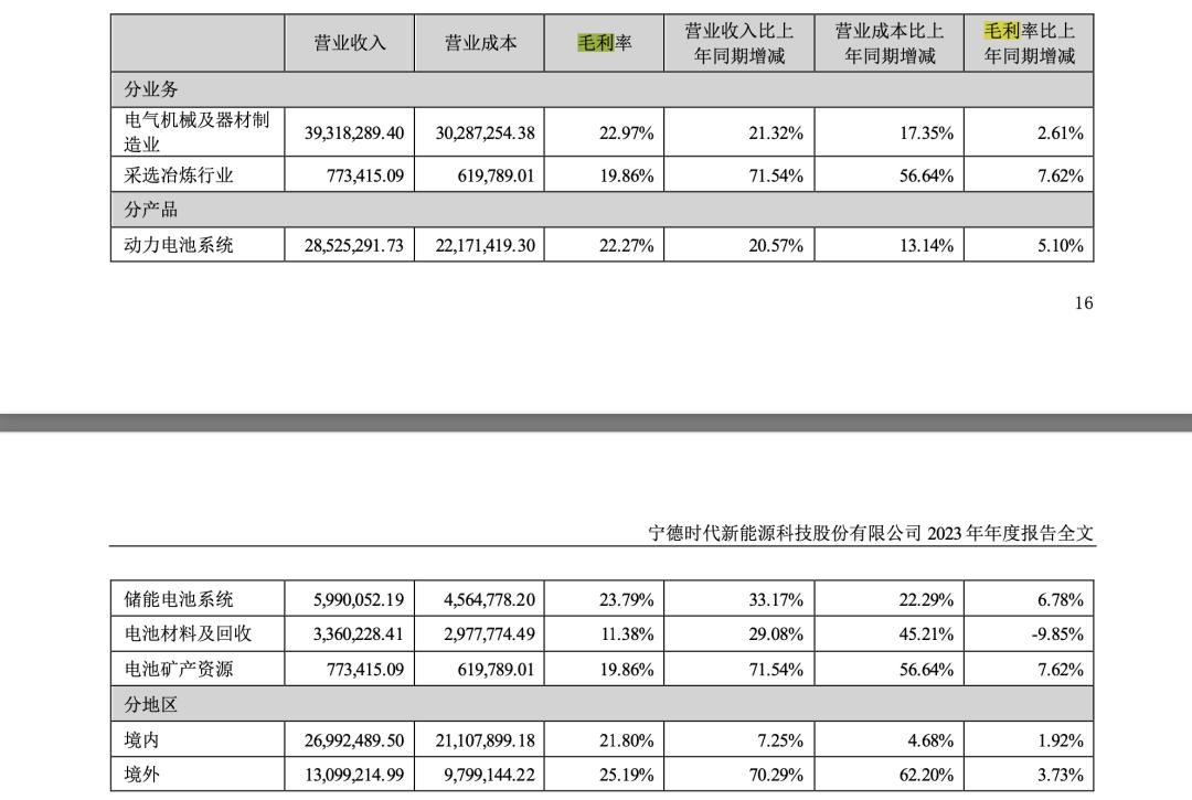更值得关注的是,宁德时代的毛利率也有所提升,从 2022 年的 20.25% 提升到 2023 年的 22.91%,超越了特斯拉(2023 毛利率为 18.2%)。具体来看,动力电池毛利率达到 22.27%,较 2022 年提升 5.1 个百分点;而储能电池毛利率为 23.79%,较上一年提升 6.78 个百分点。