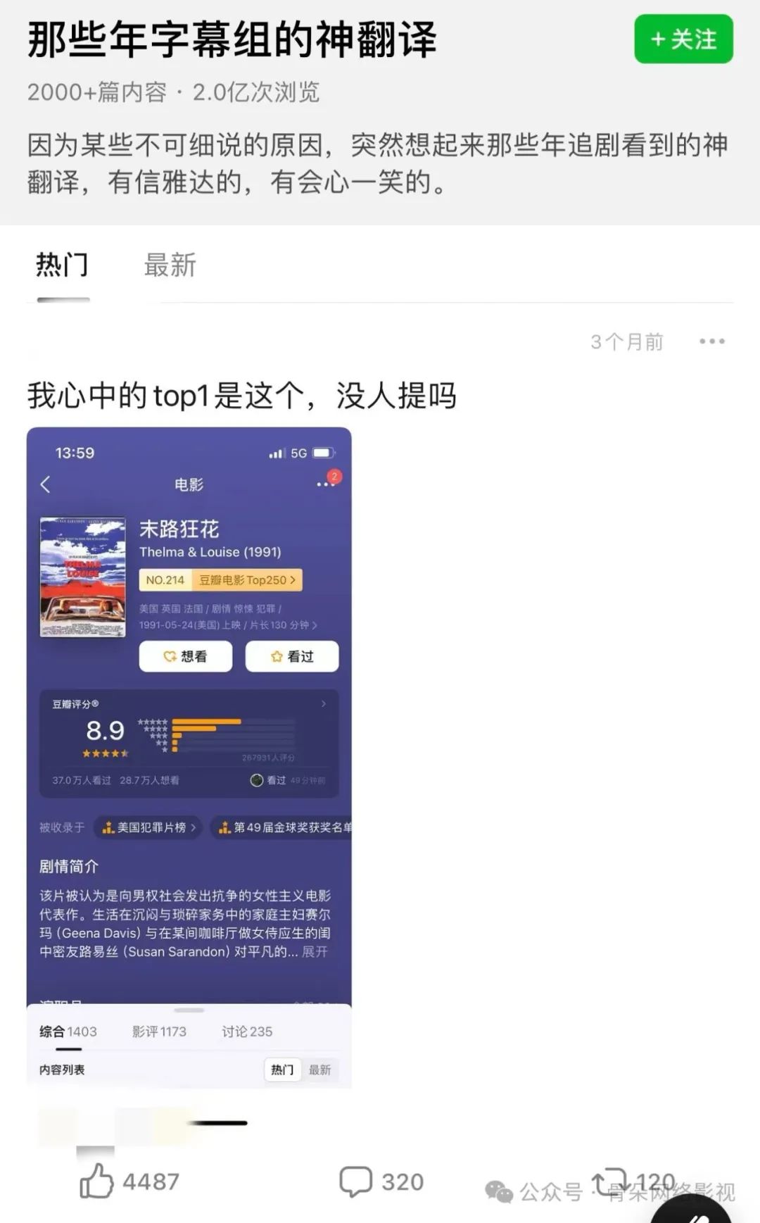 在豆瓣话题#那些年字幕组的神翻译#词条下,许多网友津津乐道着曾让自己回味无穷或者会心一笑的翻译,也有资深影剧迷,不厌其烦地反复对比着不同字幕组对同一部作品的翻译,由衷地赞叹着字幕组的顶级理解和语言功底。