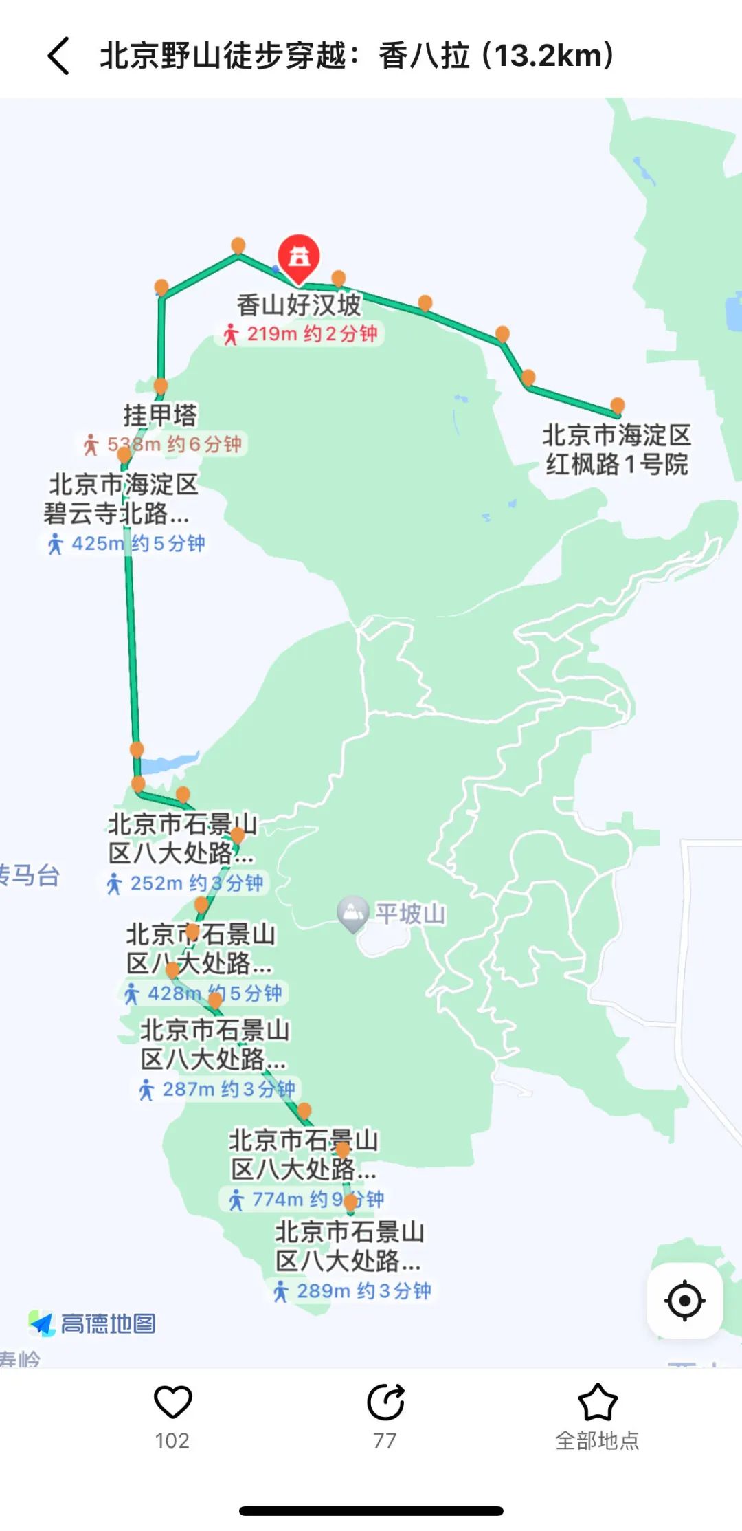 香八拉不是一条固定的路线,从香山到八大处,有很多种走法。最经典的路线是经过好汉坡、猴子爬、挂甲塔、南马场水库、翠微顶一路到终点八大处公园。