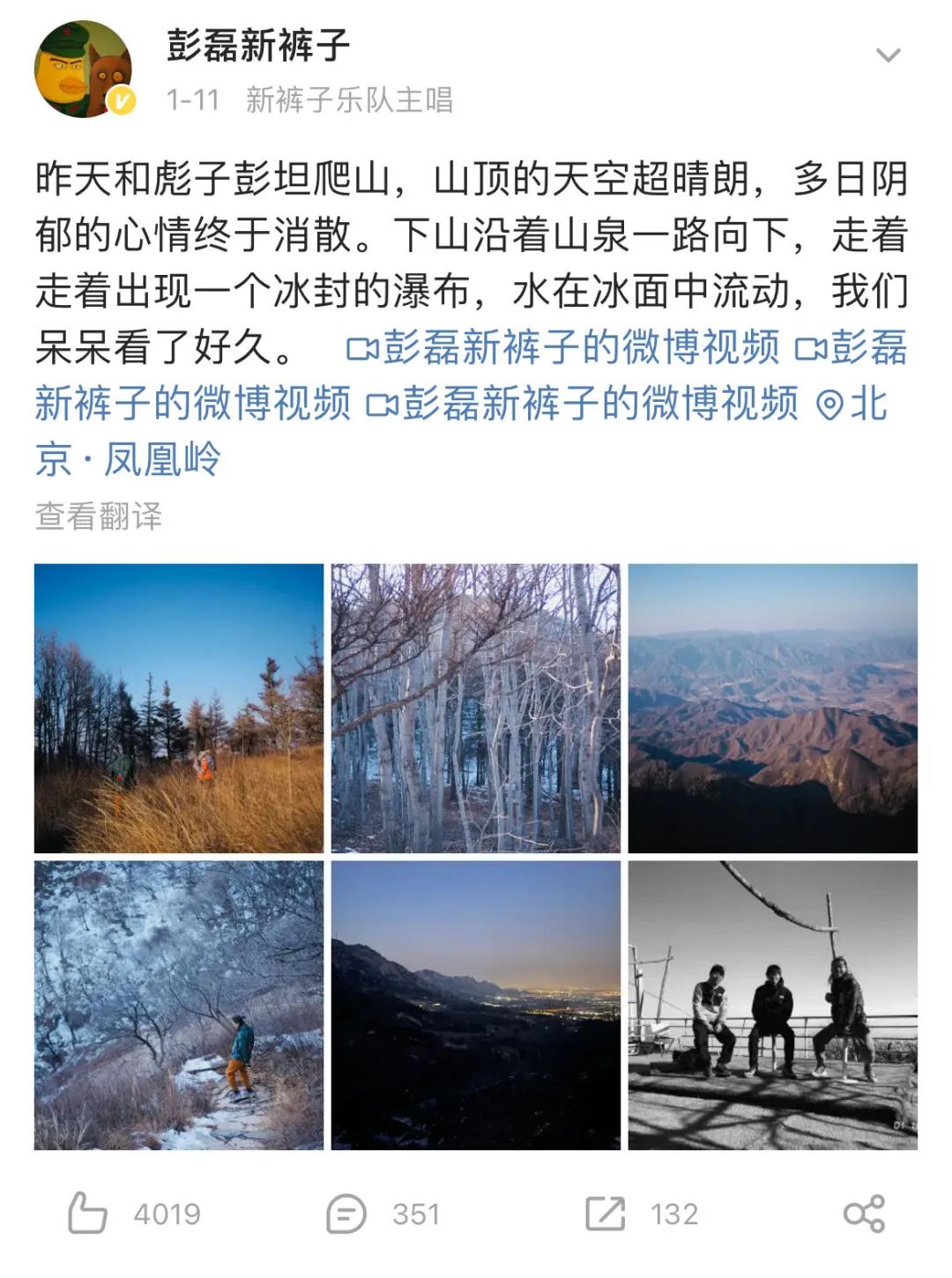 新裤子乐队的主唱彭磊酷爱爬山,他所有的微博里可能有一半共享同一个开头:昨天和彪子一起爬山。