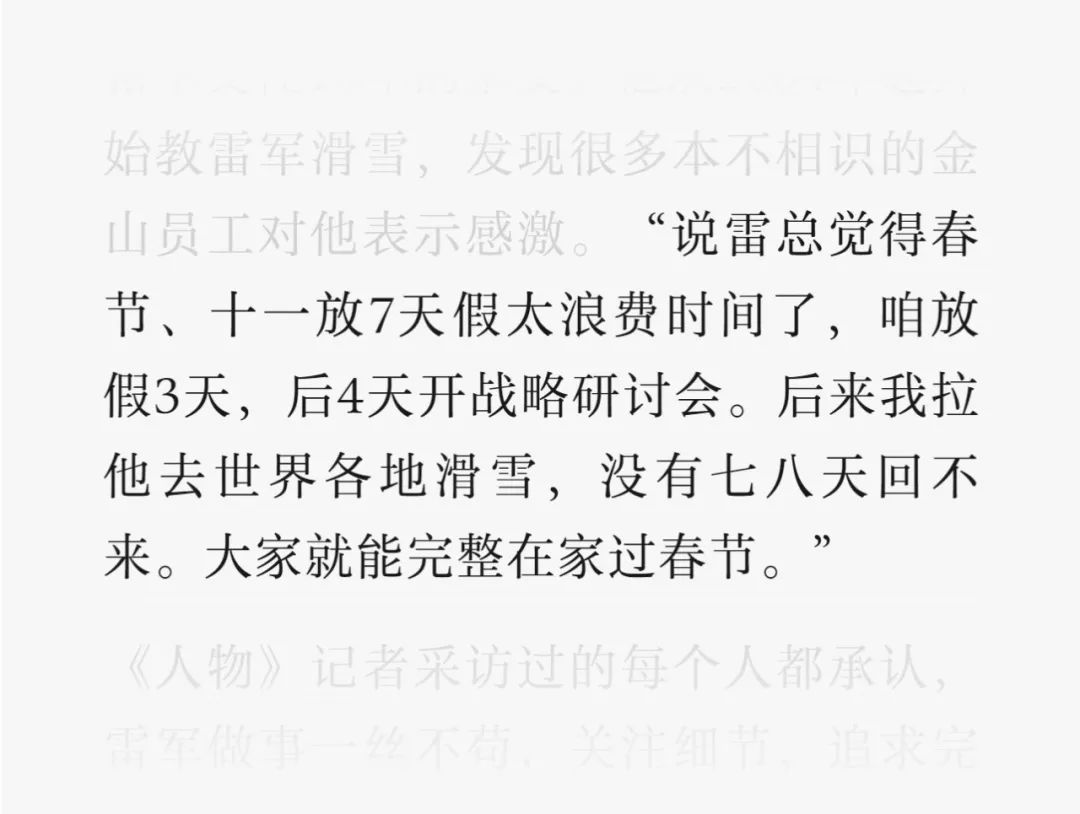 后来雷军迷上了滑雪,每年都去瑞士过年,于是金山的员工又有7天的假期了。