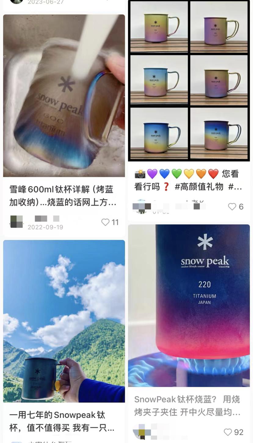 〓 snow peak纯钛杯,单价200元左右,加热后可以出现复杂的色彩