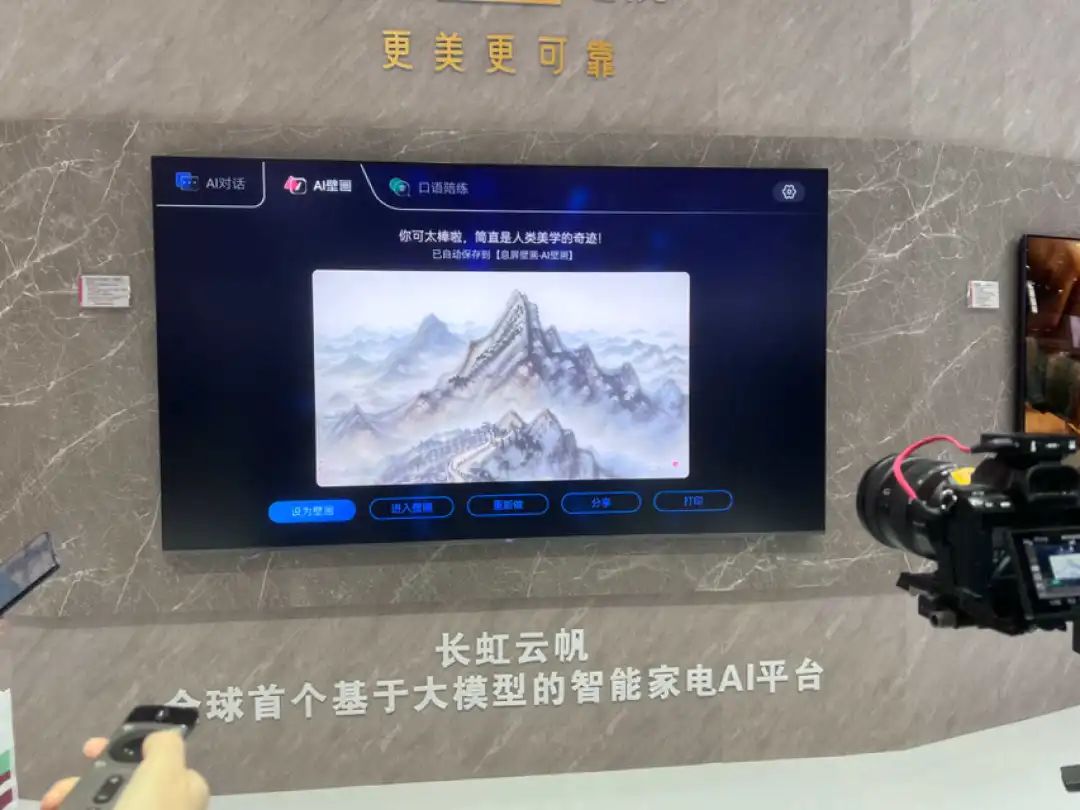 大模型落地电视,长虹也有动作。长虹旗下的云帆AI平台电视打出的标签是“全球首个基于大模型的智能家电AI平台”。它有AI对话、AI壁画和口语陪练三个功能。