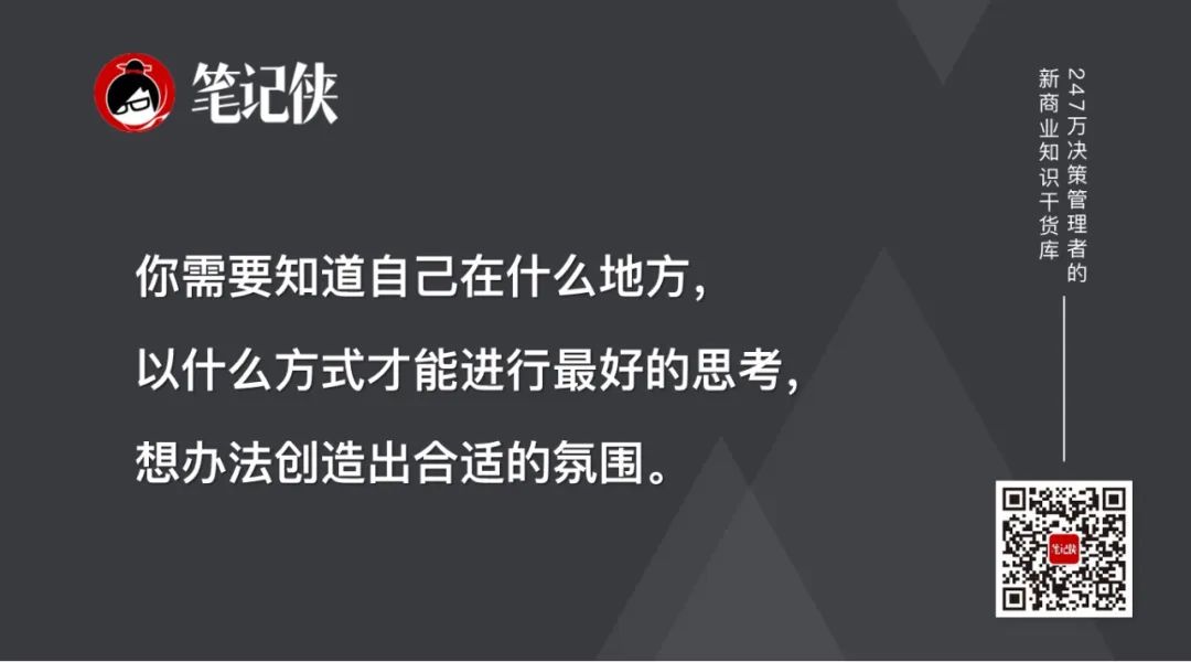 你需要知道自己在什么地方,以什么方式才能进行最好的思考,想办法创造出合适的氛围。如果你还不明确这些问题的答案,你就需要去尝试,以确定哪些最适合自己。