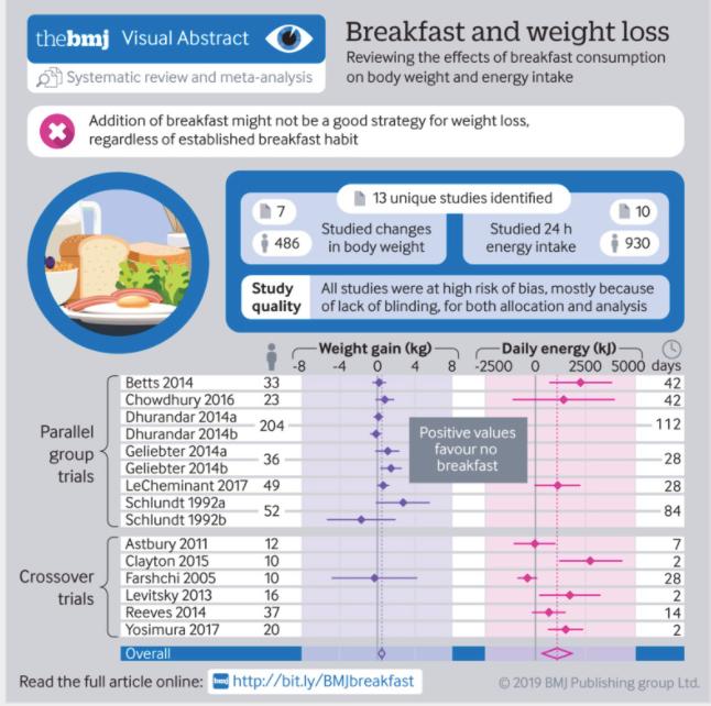 the BMJ通过统计1990年至2018年的13项实验研究,发现不吃早餐者每日平均卡路里摄入比吃早餐者低259.79卡,具有统计学意义。