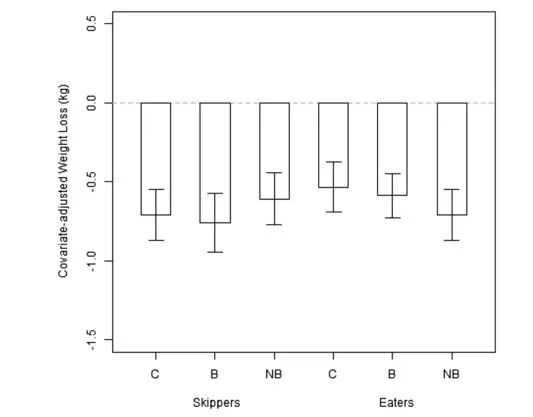 B为早餐组,NB为不吃早餐组,差异无统计学显著意义 来源:The effectiveness of breakfast recommendations on weight loss: a randomized controlled trial