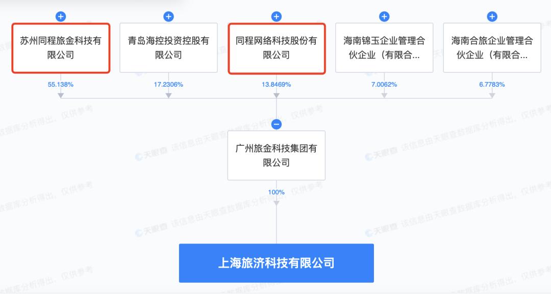 值得注意的是,上海旅济是同程旅行关联公司。天眼查信息显示,同程网络科技股份有限公司(以下简称“同程网络”)和苏州同程旅金科技有限公司(以下简称“苏州同程”),合计持有广州旅金68.99%的股权。而后者则持有上海旅济的100%股权。