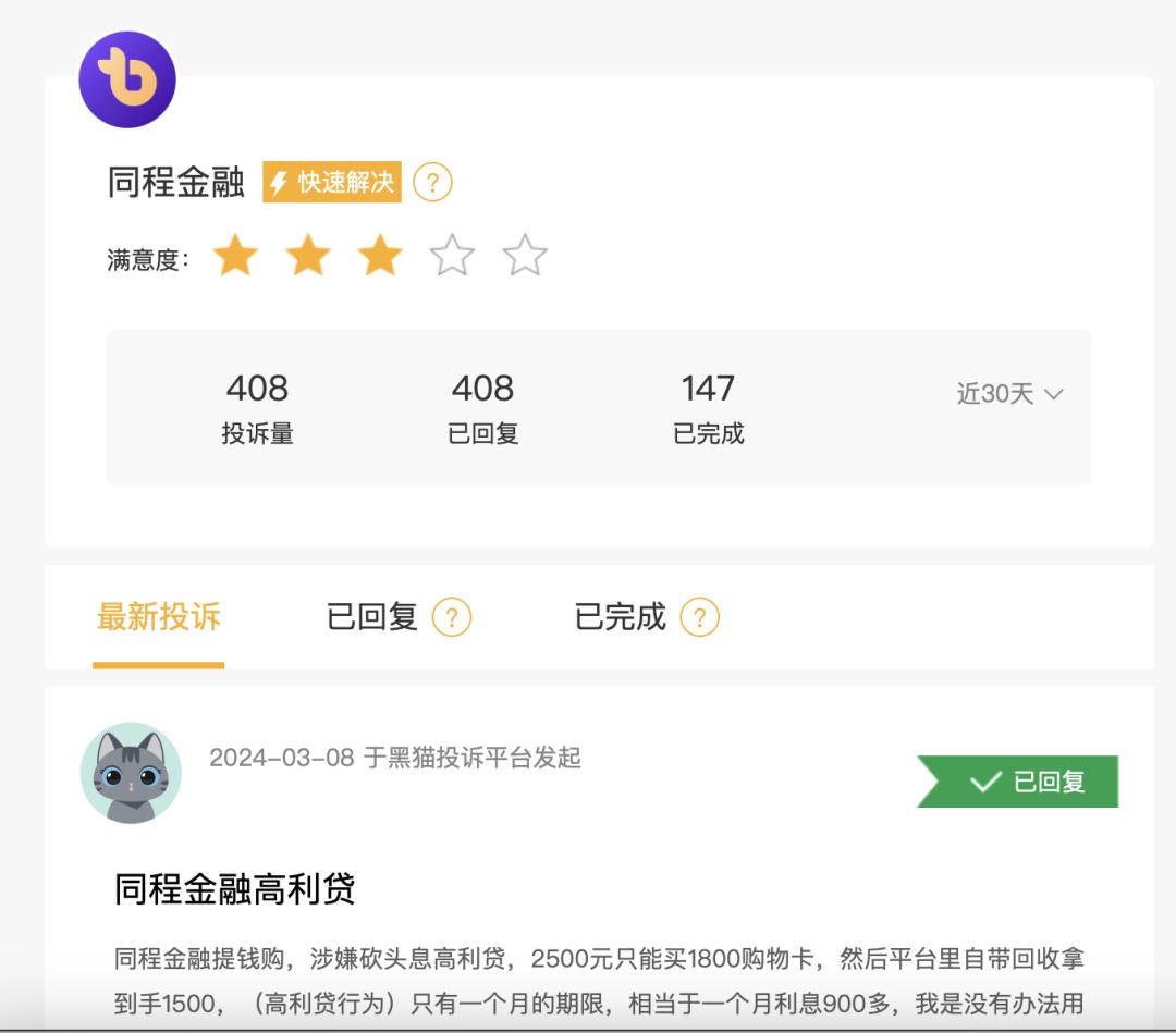 「市界」在消费者投诉平台黑猫投诉上了解到,同程金融曾多次因“高利贷”“恶意收费”“捆绑销售”“套路贷”等问题,而被用户投诉。