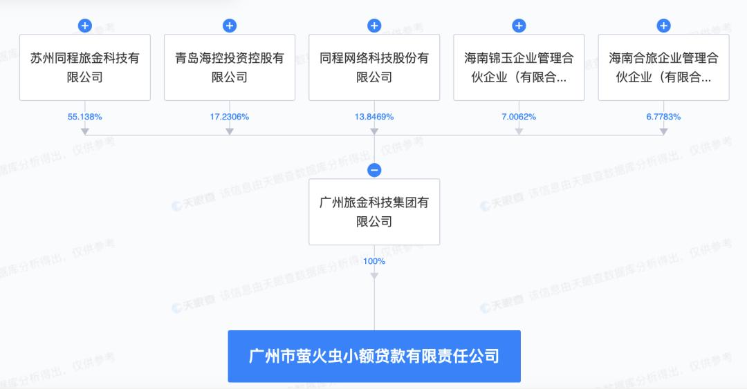 另外颇为值得一提的是,广州旅金不仅直接或间接布局了多项金融业务,它还是广州市萤火虫小额贷款有限责任公司(以下简称“萤火虫小贷”)的唯一股东,后者使得同程旅行成为国内第一批拿到互联网小贷牌照的在线旅游企业之一。