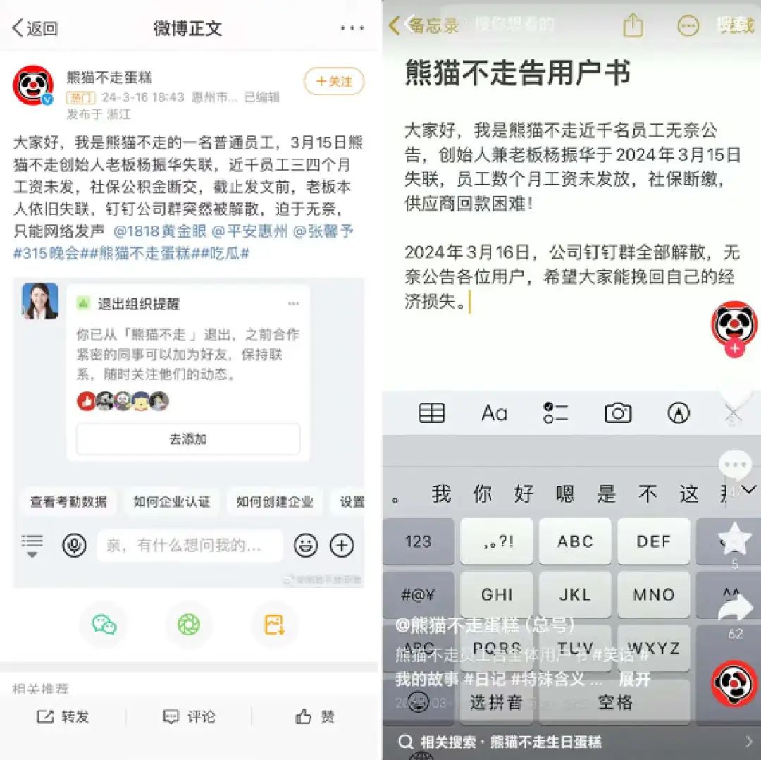 日前,内参君刷到一则由网红蛋糕品牌熊猫不走官方微博账号发布的“员工讨薪”内容,发布日期是昨天(3月16日),博文内容——