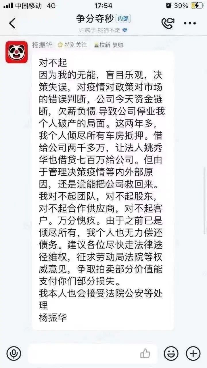 此外,还有一则“熊猫不走告用户书”在抖音平台流传,内称“员工数个月工资未发放,社保断缴、供应商回款困难”。