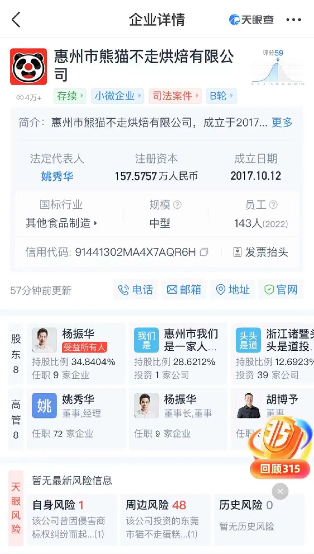 据悉,熊猫不走是一家于惠州创建的互联网蛋糕品牌。天眼查显示,惠州市熊猫不走烘焙有限公司成立于2017年10月,注册资本约157.58万元人民币,法定代表人为姚秀华。董事长杨振华持股比例约为34.84%。