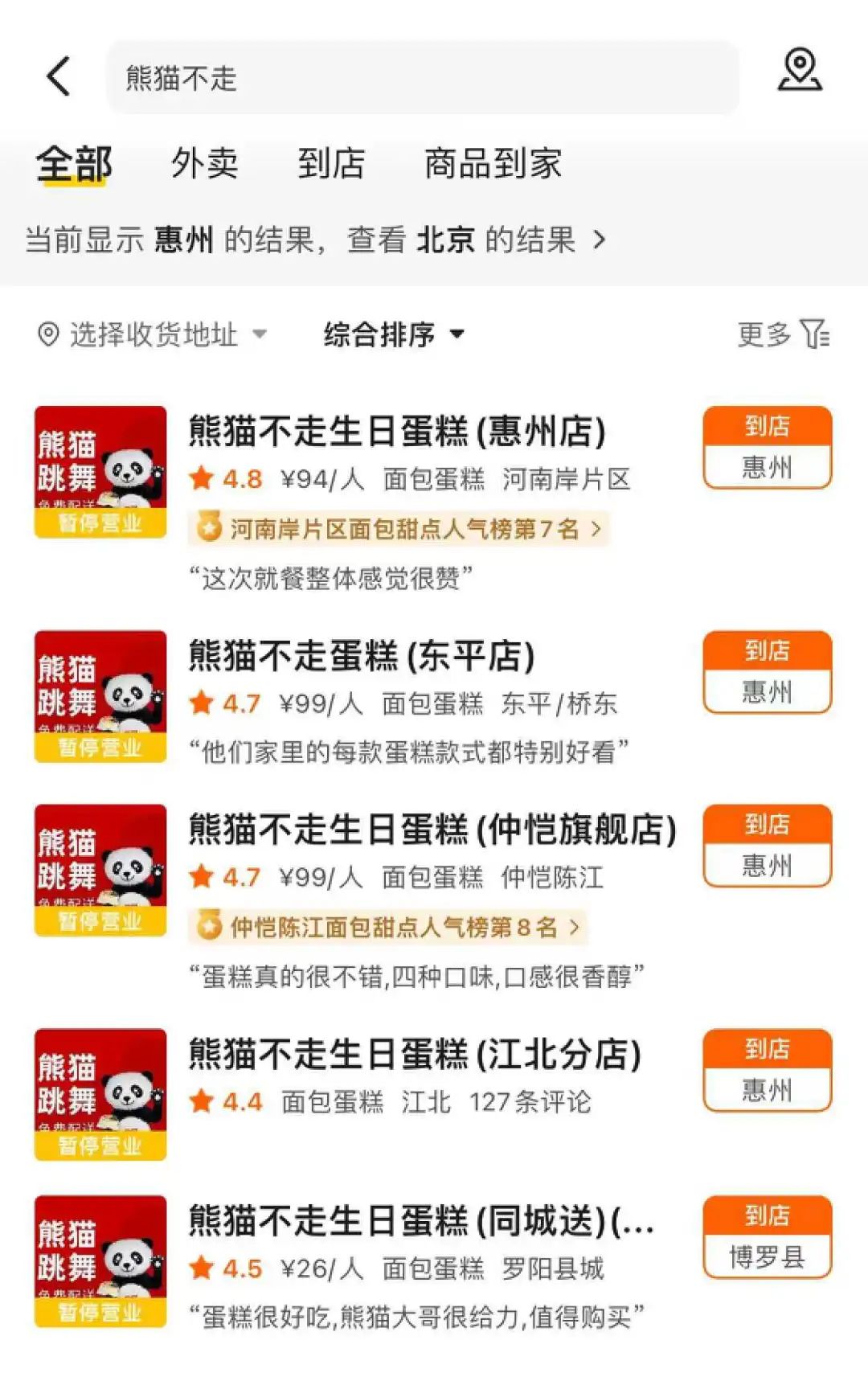 内参君打开美团搜索,北京的两家熊猫不走门店都已显示暂停营业,最新的买家评价都停留在了今年三月初,而在熊猫不走“大本营”的惠州当地,也是一色儿地全部都暂停营业。