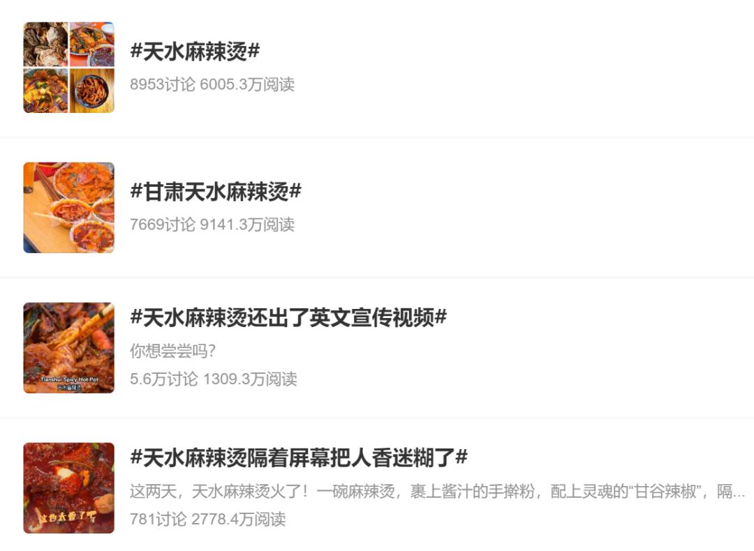 天水麻辣烫在网络上的热度裂变式增长,话题持续发酵。微博 #天水麻辣烫# 及相关话题讨论度破亿、抖音相关阅读人数突破6.9亿次、小红书上有上万条帖子更新着甘肃麻辣烫的最新动态……