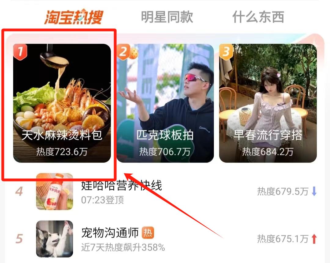 商用版原材料搜索量激增。3月13日,淘宝平台显示,商用版 #天水麻辣烫料包# 冲上了淘宝热搜榜,723.6万的热度稳坐榜一大哥位。